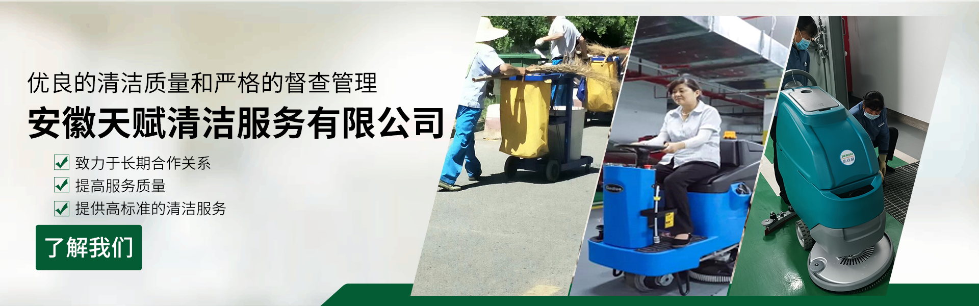 安徽天賦清潔服務有限公司是的服務型企業,主要從事道路清潔、物業托管保潔、工程開荒、高空作業、地毯清洗、石材翻新等多項服務為一體的環保型清潔公司。公司管理機制完善,清潔作業經驗豐富,擁有技術力量,嚴格實行崗前培訓—崗中督查—上崗在培訓的員工管理措施,憑著優良的清潔質量和嚴格的督查管理,為眾多企事業單位、醫院、酒店、廠區商場、物業、道路、學校、公園等提供后勤清潔服務。在業內擁有良好的口碑。工作人員,服務態度優,竭力為客戶提供好的保潔服務。安徽天賦清潔服務有限公司:致力于長期合作關系,提高服務質量,提供高標準的清潔服務。公司的經營理念:為營造一個更清潔、亮麗的生活和工作環境而努力!“誠信”是公司成功保證。“客戶至上,信譽為首”是公司宗旨。高標準提供服務,維護客戶利益、形象,是我始終不渝的目標。